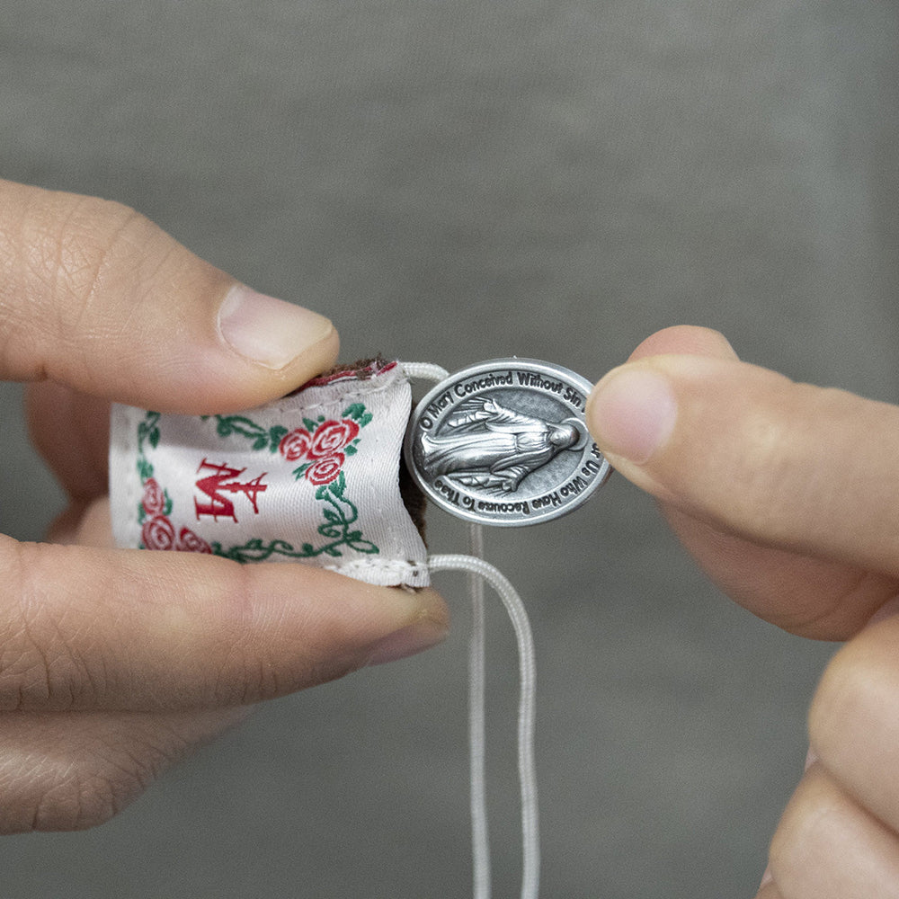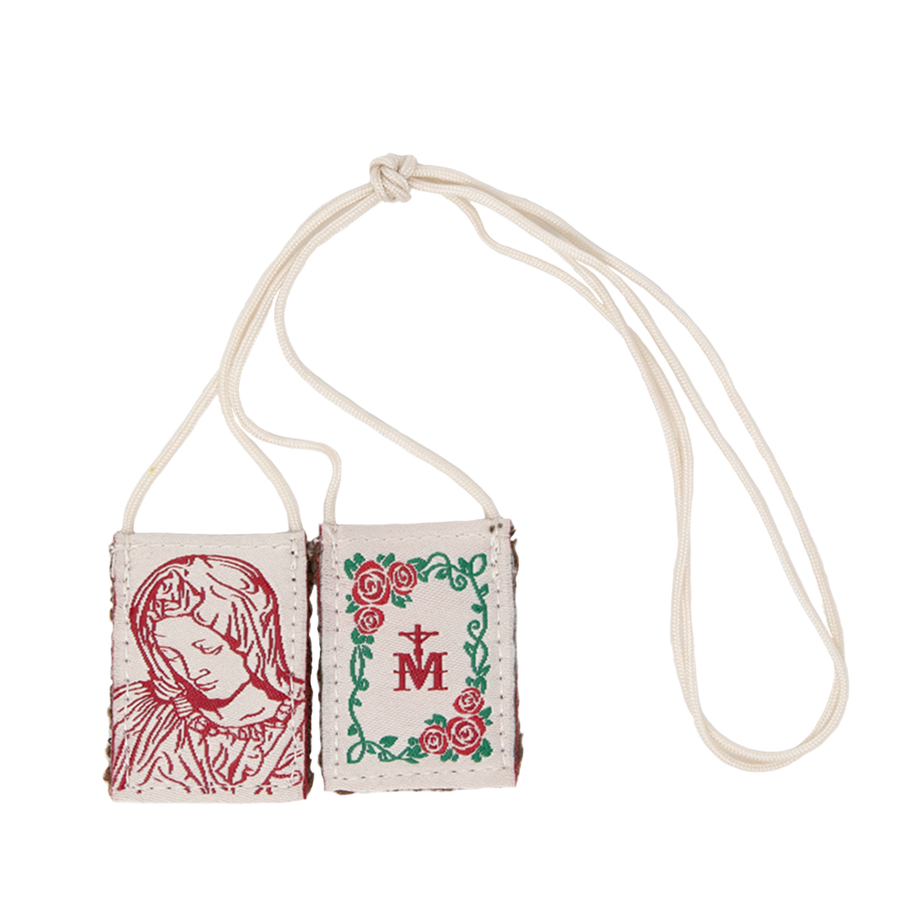 This brown scapular features a beautiful rose-colored image of Our Lady as she appears in Michelangelo’s Pietà.